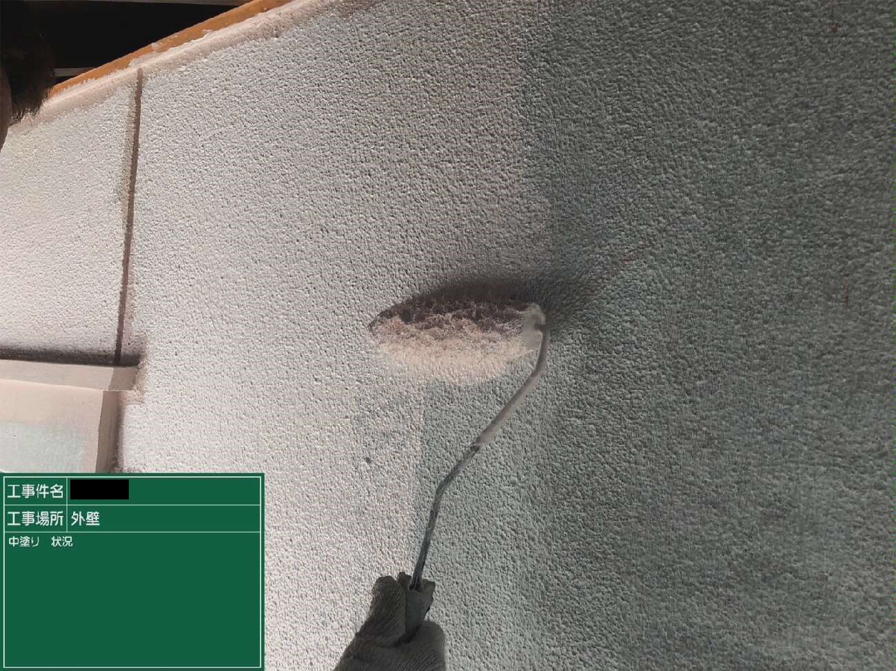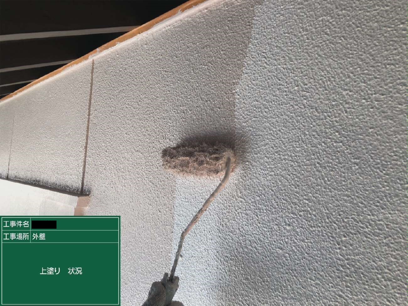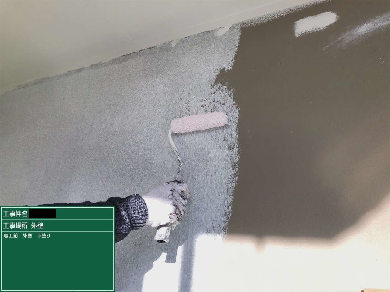外壁、下塗り作業の様子です。塗料の密着度を高め塗膜剥離を防ぎます。