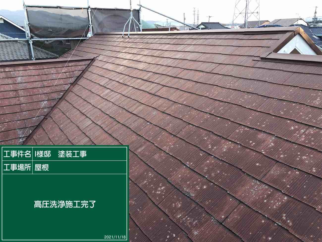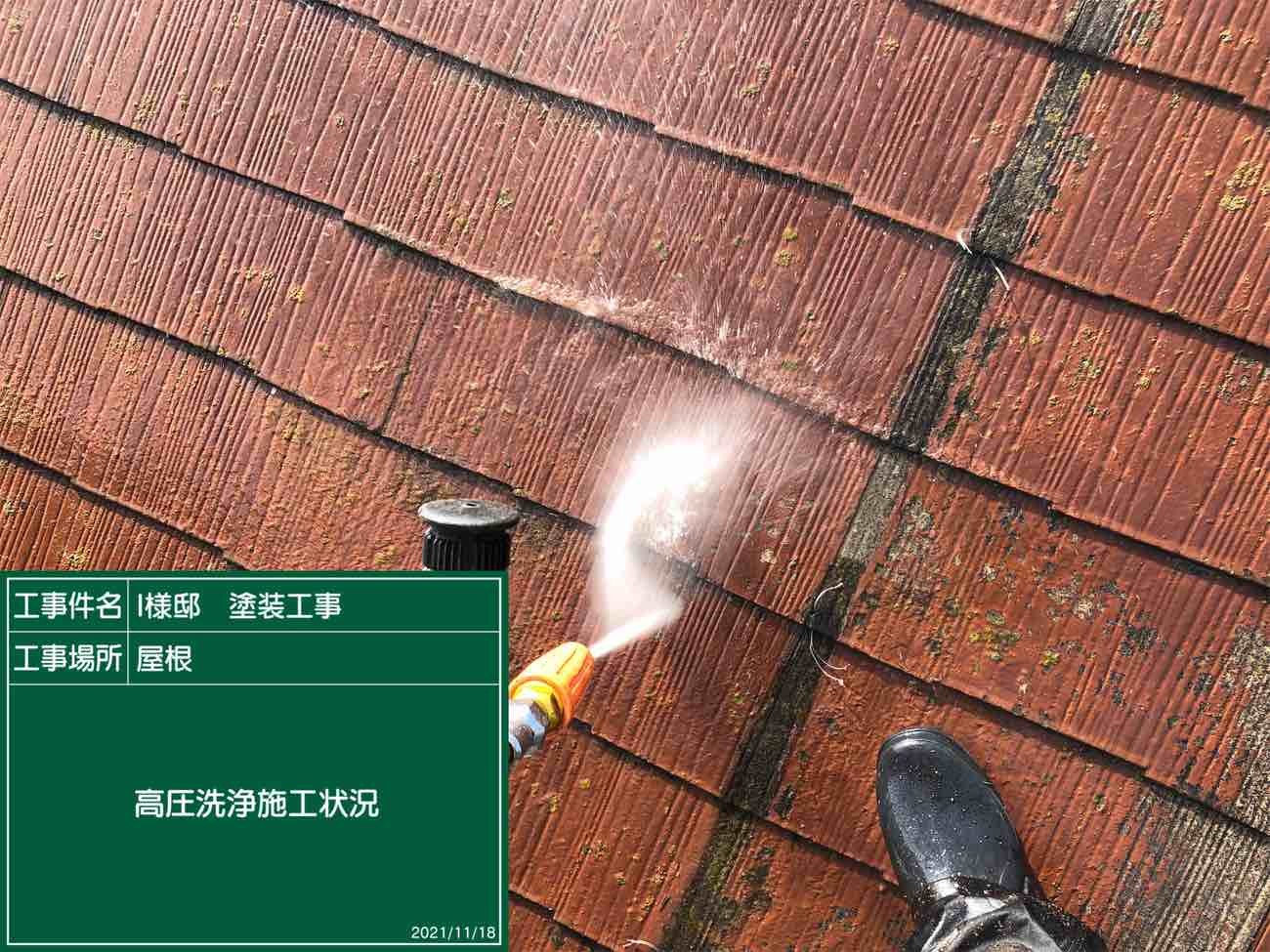 屋根の高圧洗浄作業を行います。屋根に付着しているごみなどを高圧洗浄できれいに落としていきます。