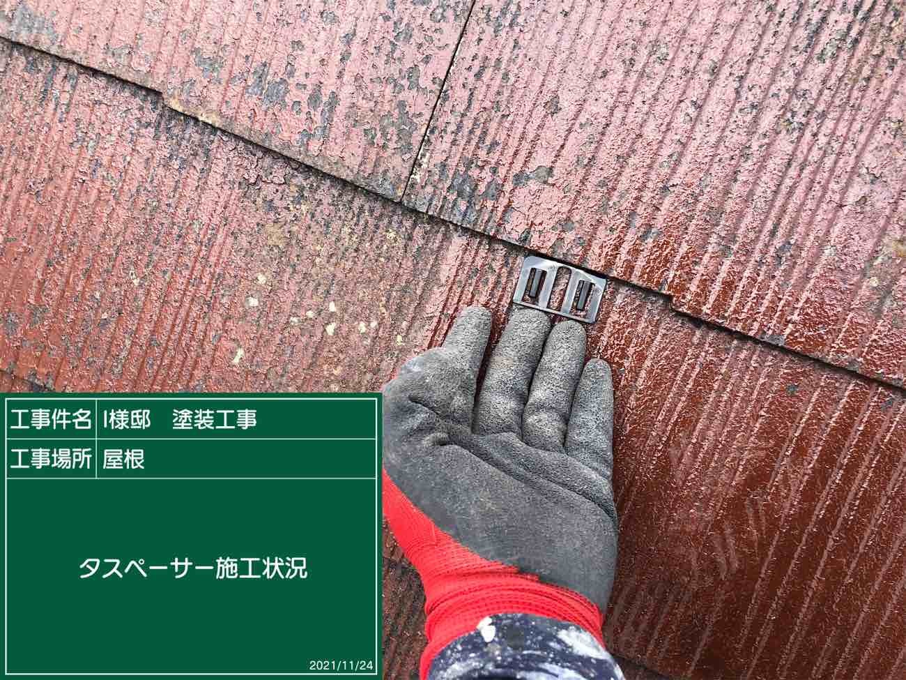 屋根の塗装を行う前に、屋根に縁切りの役割のあるタスペーサーを入れ込みます。