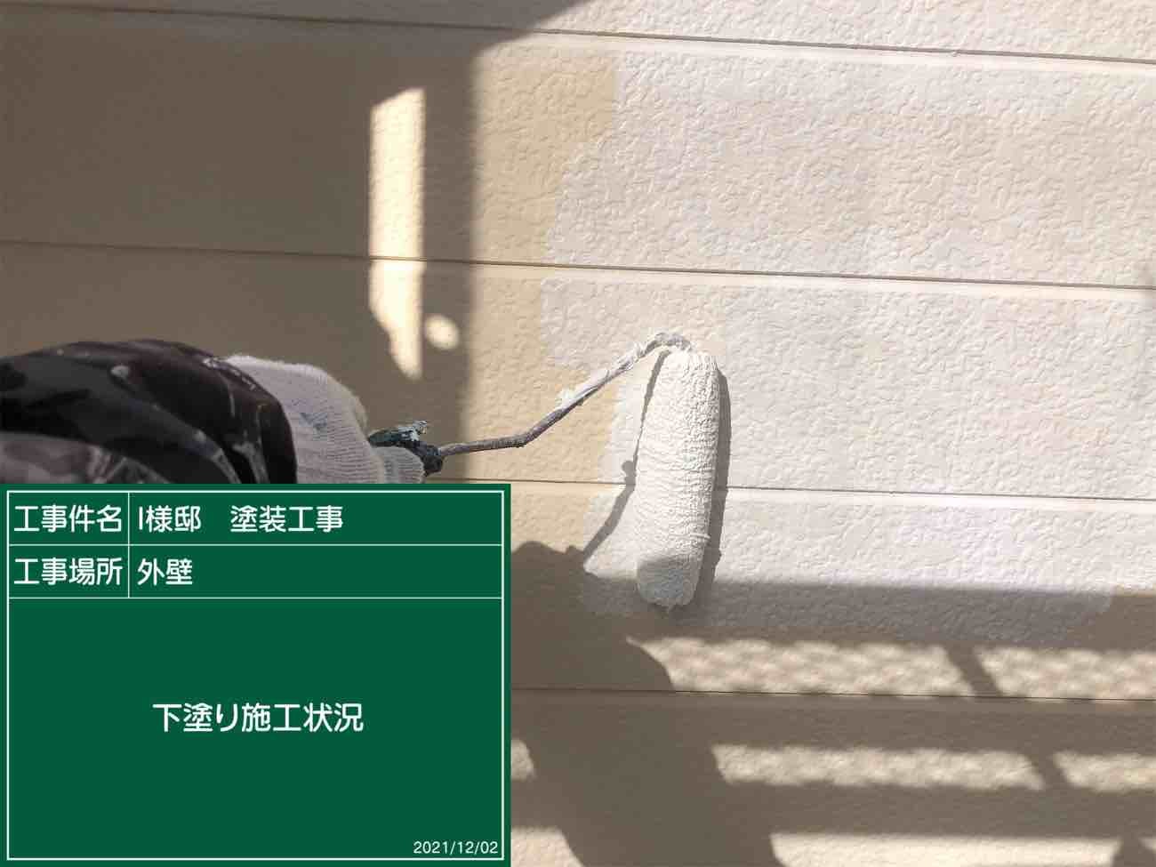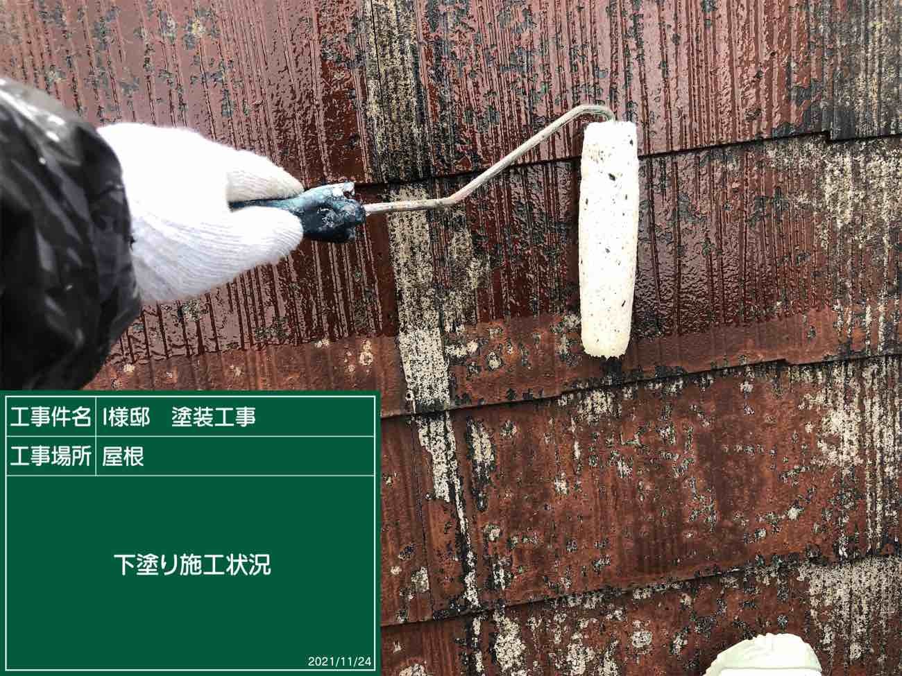 屋根の下塗りを行います。下塗りで下地と塗料の密着性を高めます。