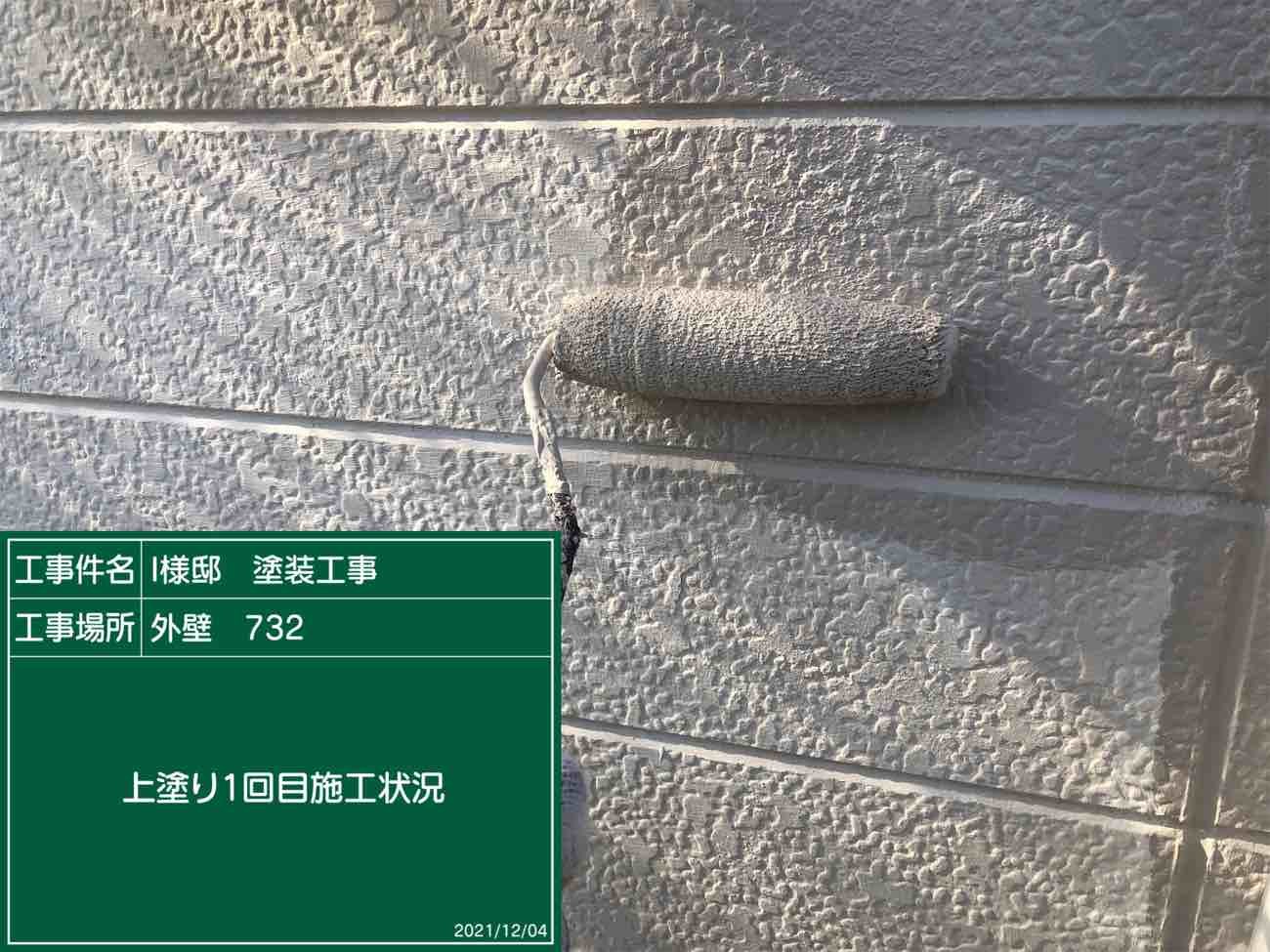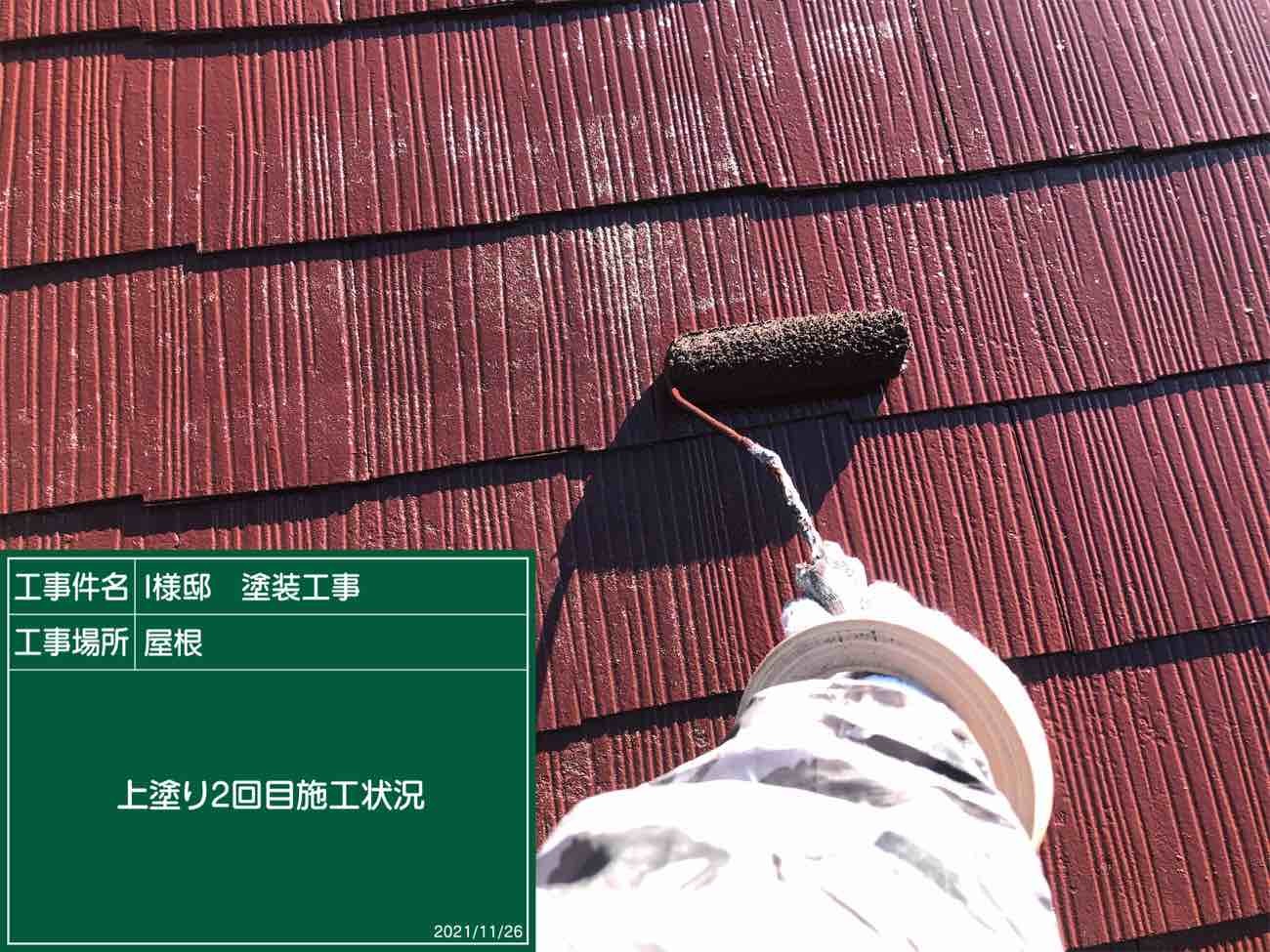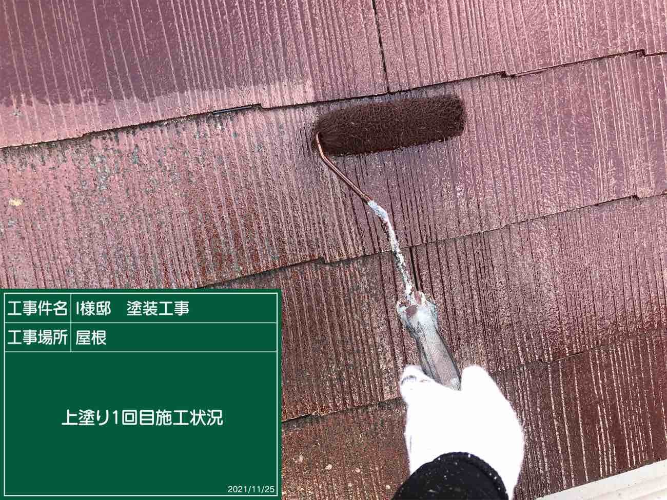 屋根の一回目の上塗りを行います。これは中塗りとも言い、下塗りと上塗りの間の工程の為そういいます。