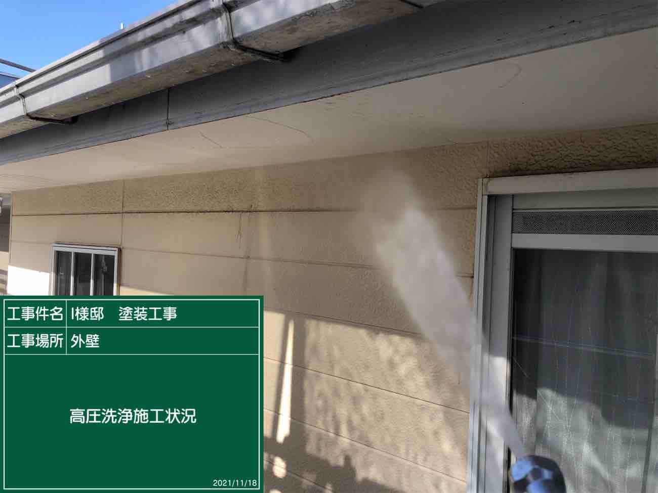 外壁高圧洗浄作業を行います。外壁も屋根と同様にきれいにしていきます。