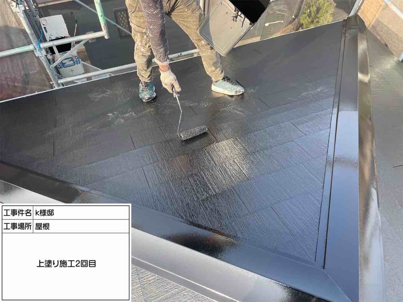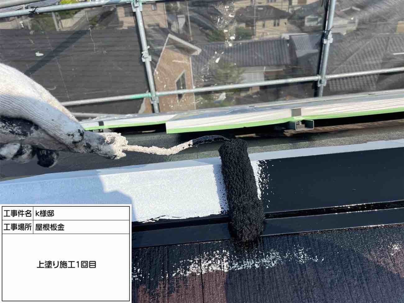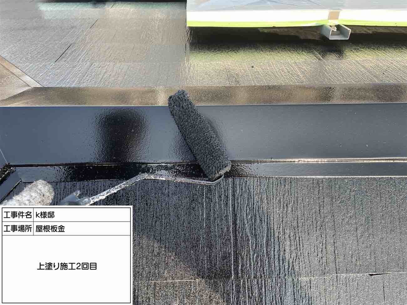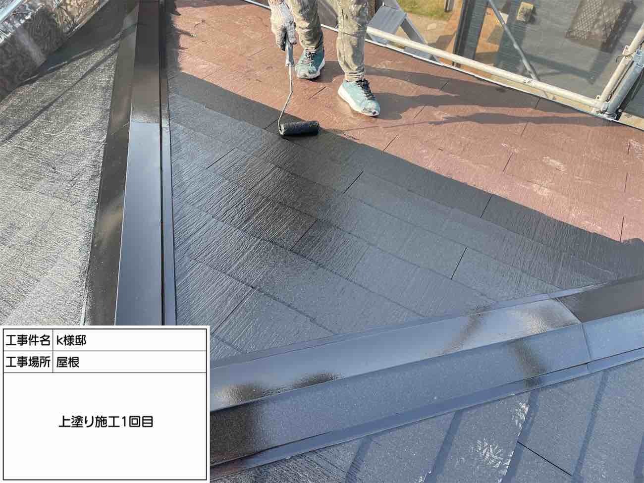 屋根の上塗りです。こちら1回目の上塗りは一般的に「中塗り」と言われます。