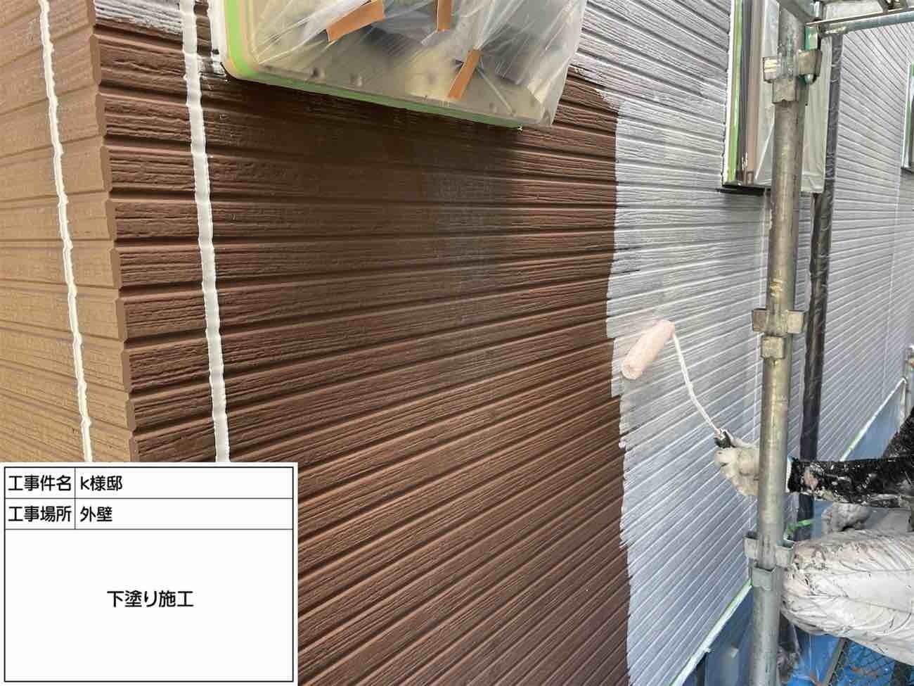 次に外壁塗装作業を見ていきます。 こちらは先程の屋根と同じく3回工程で塗装を行っています。下塗りの工程から進めて行きます。