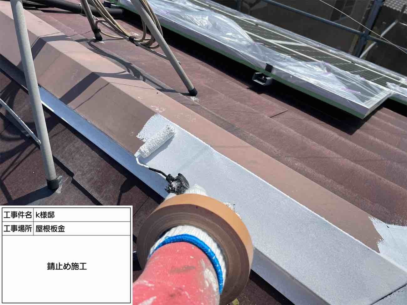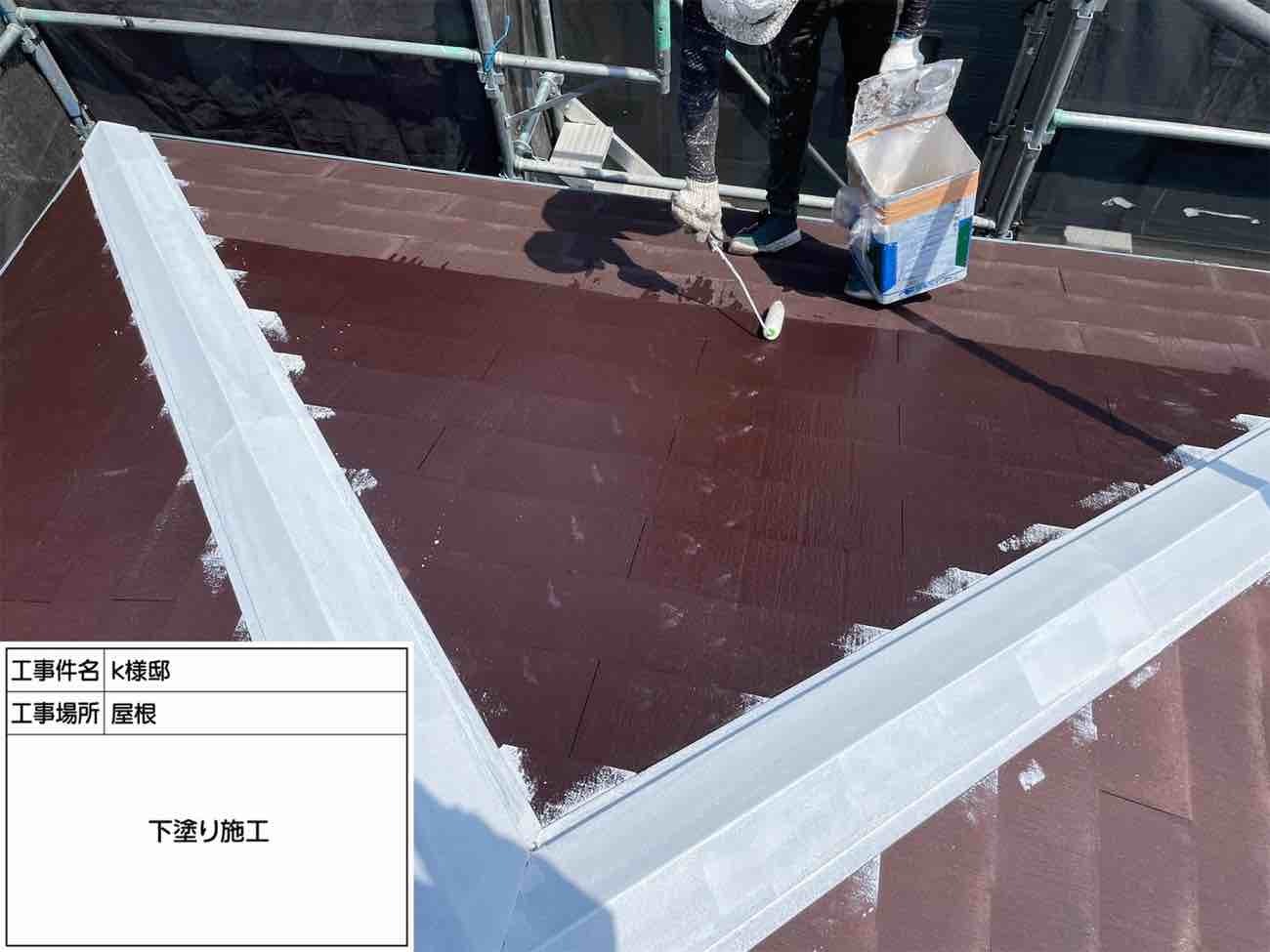屋根も同様に塗装を行って行きます。 屋根の下塗り作業の様子です。下塗りで塗料の密着性を高めていきます。
