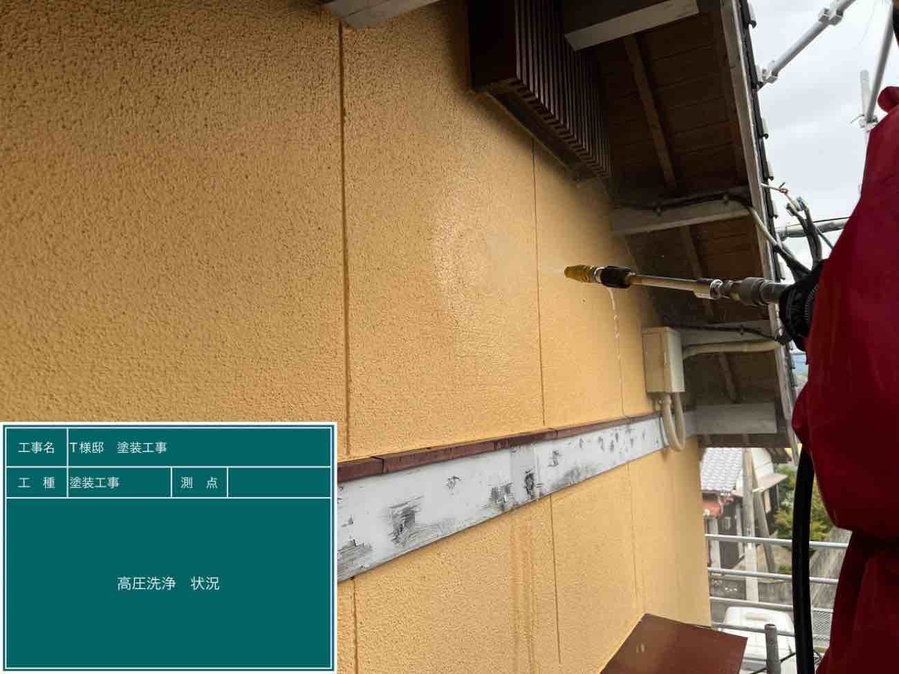 外壁の洗浄作業を行います。 外壁に付着している汚れを落としていきます。