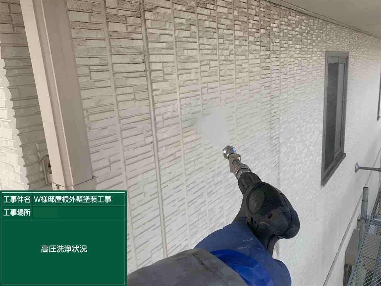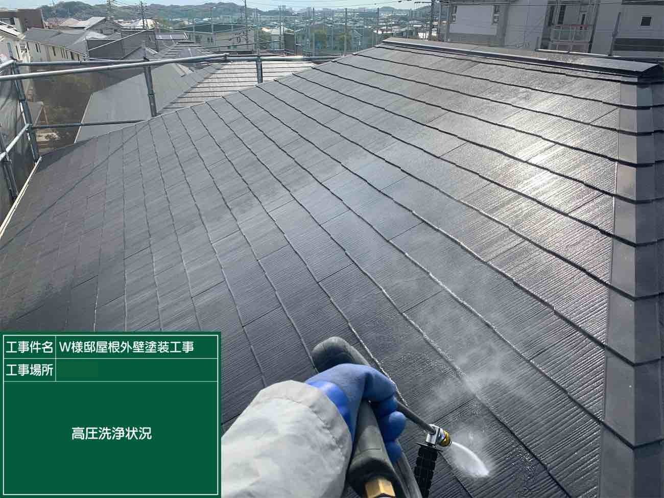 屋根の高圧洗浄作業を行います。汚れを落としていきます。