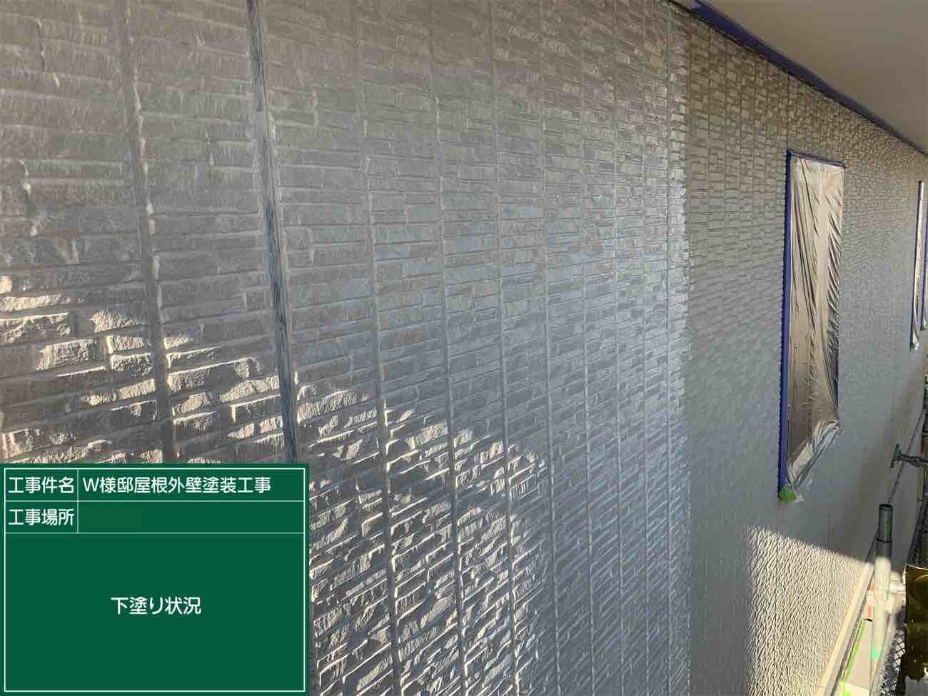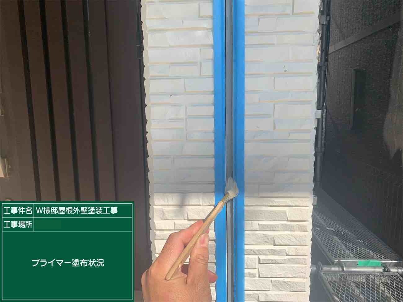 外壁の下塗り塗装を行います。下塗りで上塗り塗料の密着性を高めていきます。