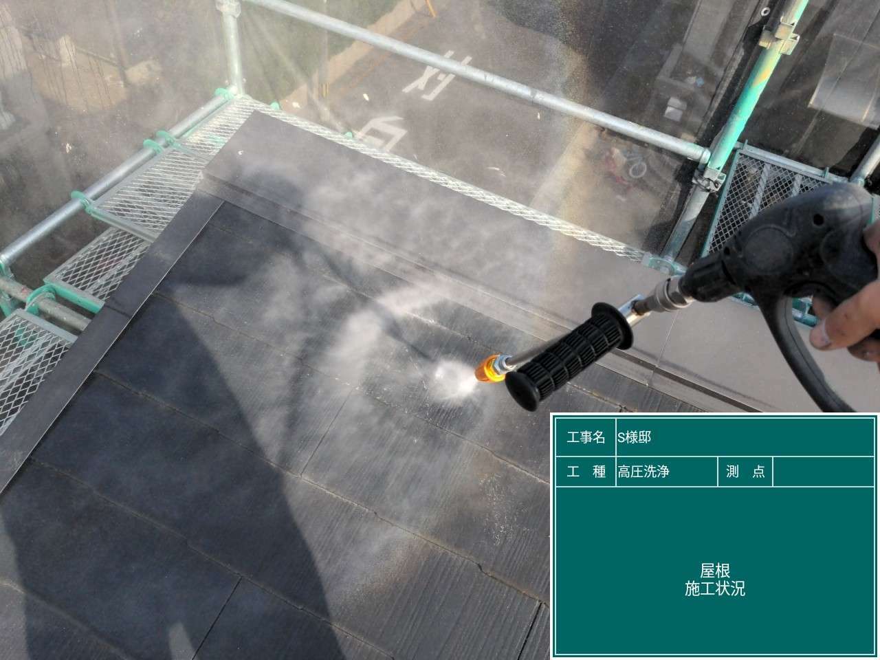 屋根の洗浄作業を行っていきます。 屋根の付着している汚れなどを撤去していきます。