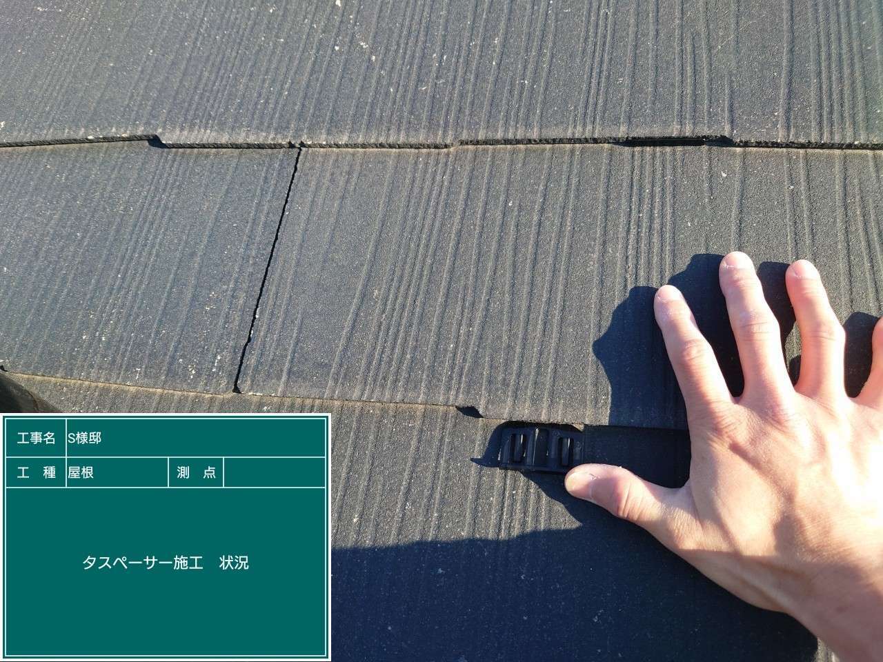 屋根の塗装を行う際は、塗料で塗膜ができ空気の通りが塞がってしまうため、タスペーサーをいれ空気の通りを確保していきます。