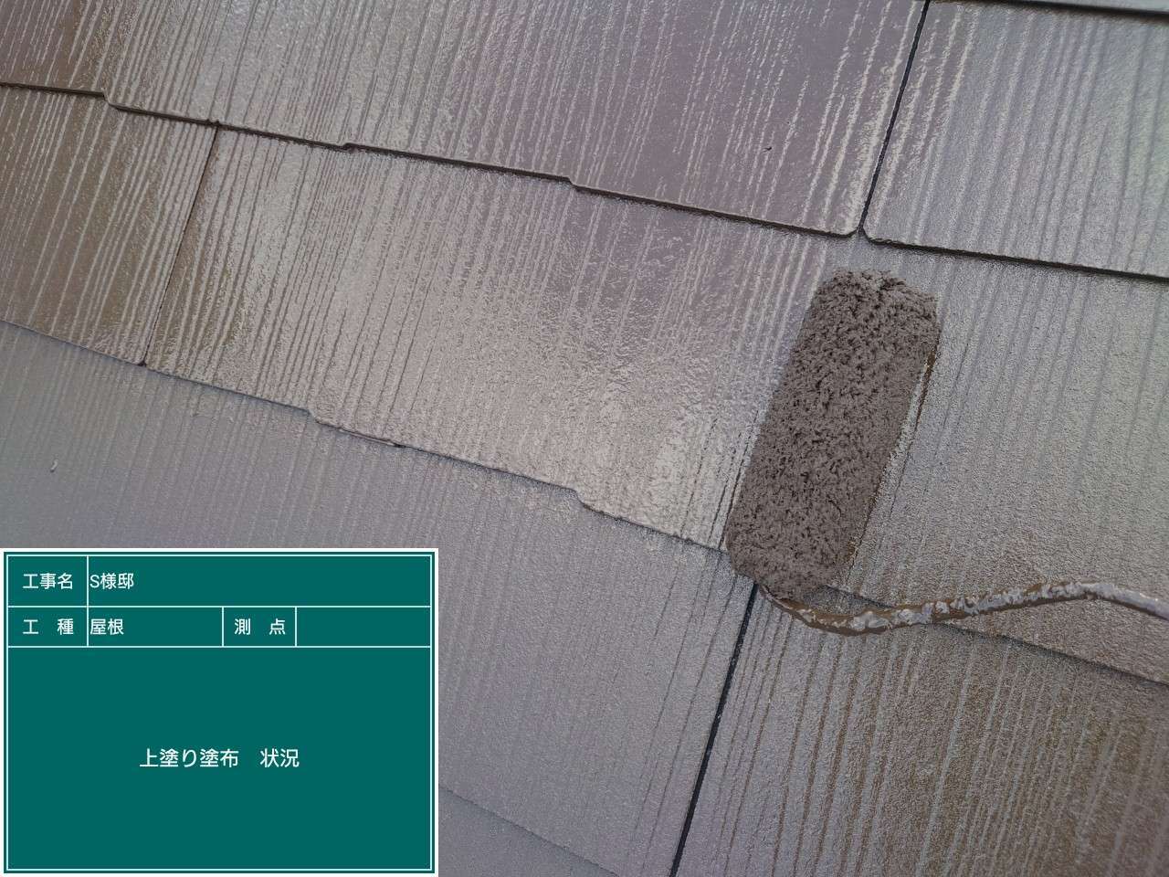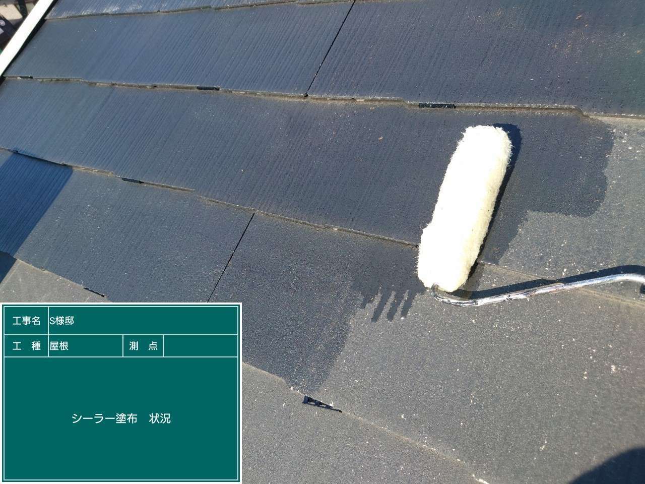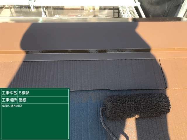 屋根の下塗り塗装作業です。 屋根も同様に3回塗りを行っていきます。