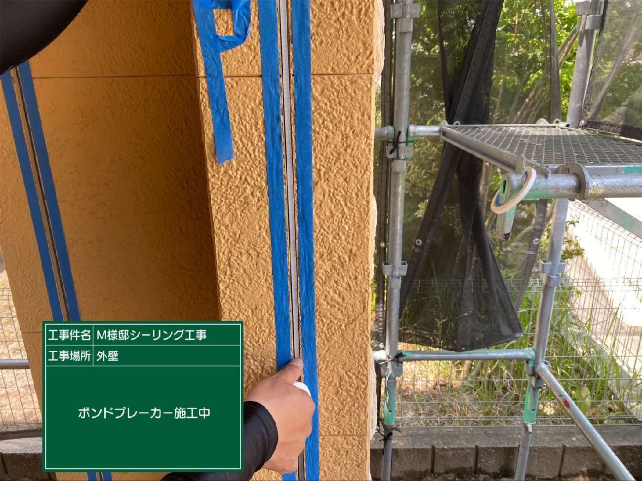 目地の底にボンドブレーカーというテープを接着していきます。これで目地の3面接着を防ぎます。