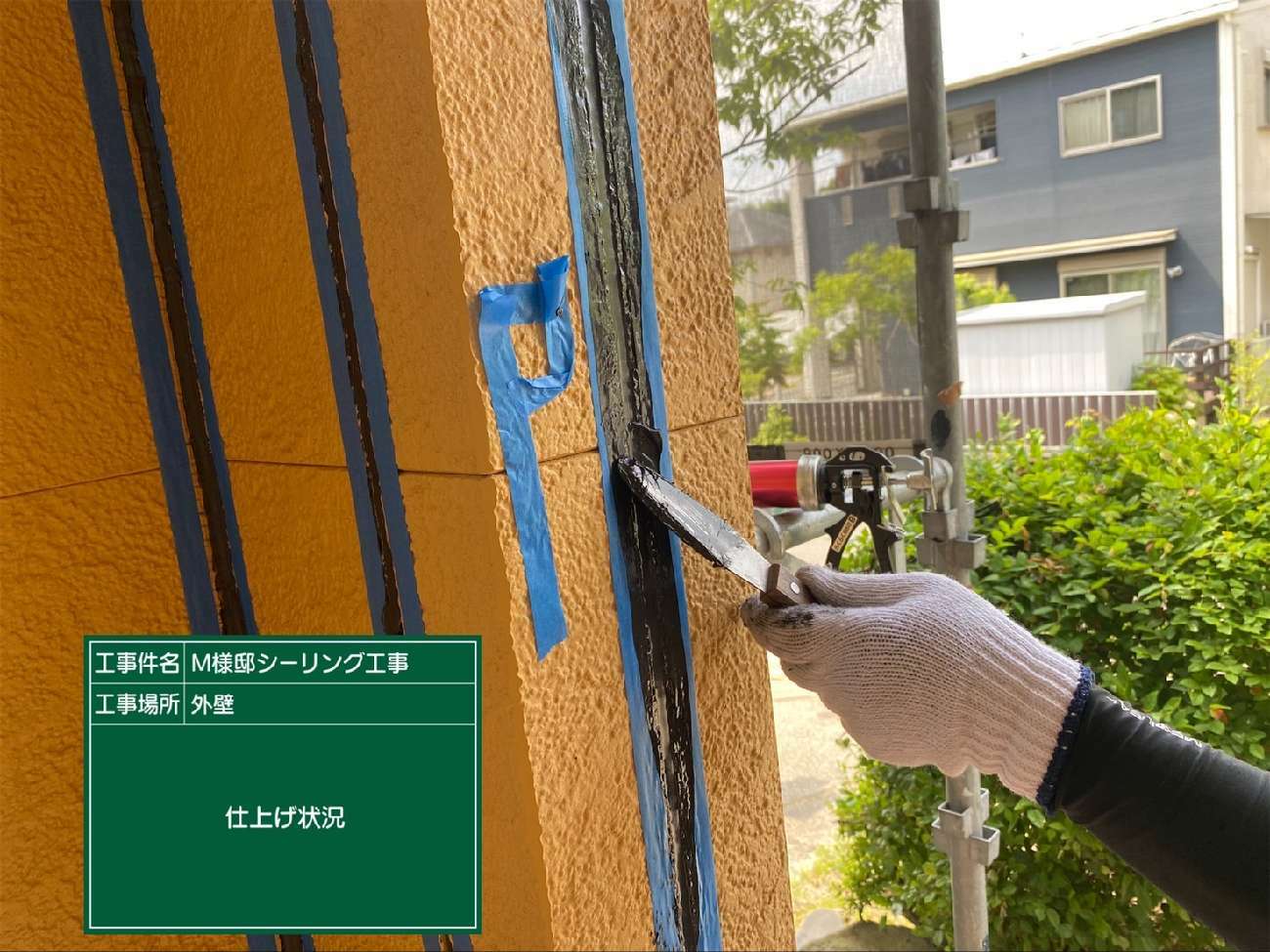 充填後、へらを使用してシーリング材を均していきます。 見た目を美しくするだけではなく、中の気泡や隙間を埋める役割があります。