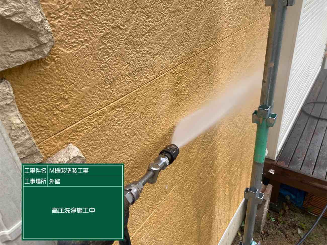 外壁の付着している汚れなどを撤去していきます。 洗浄完了後は乾燥に時間を空けていきます。
