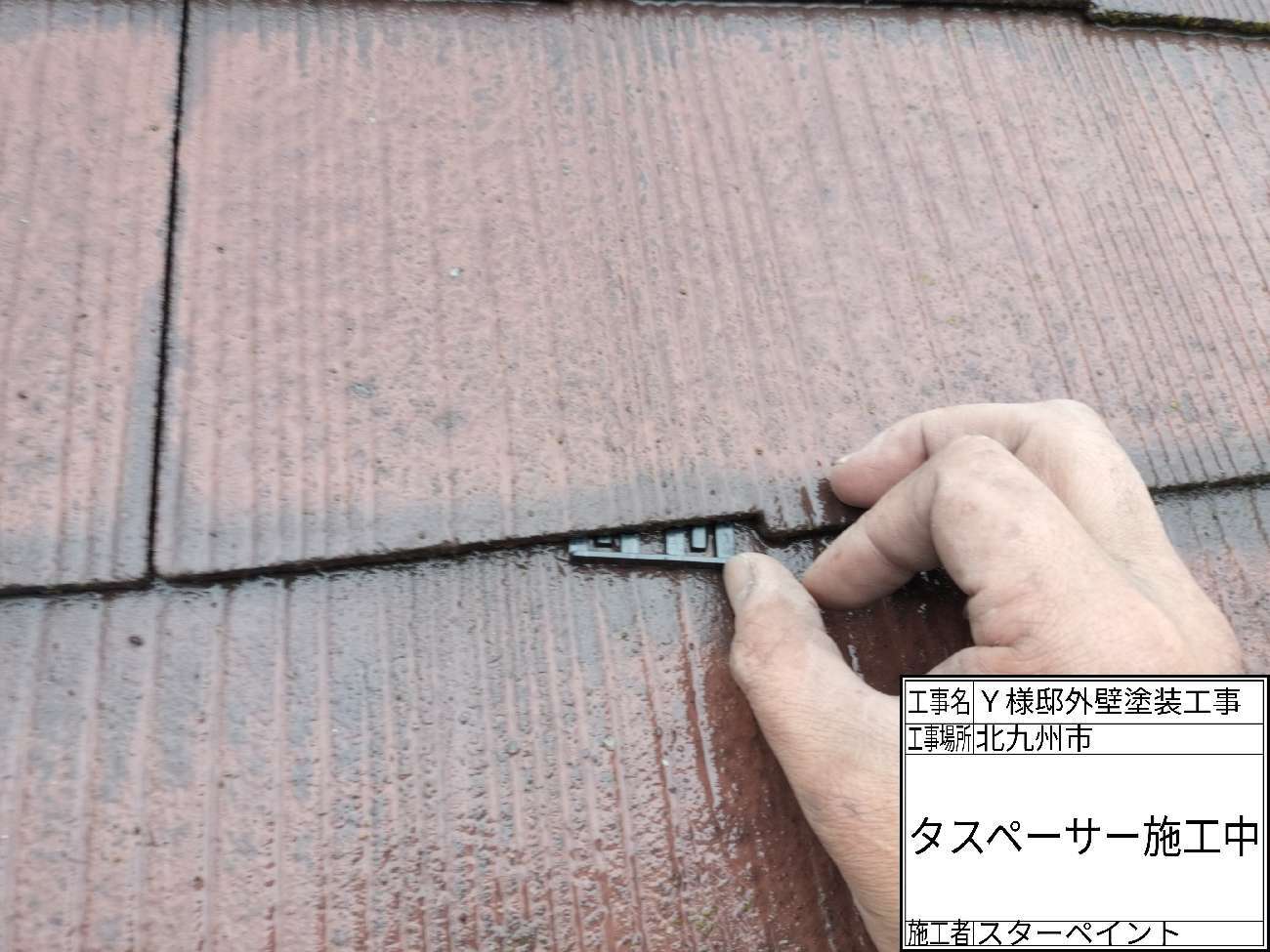 屋根の塗装を行う際は、塗料で塗膜ができ空気の通りが塞がってしまうため、タスペーサーをいれ空気の通りを確保していきます。