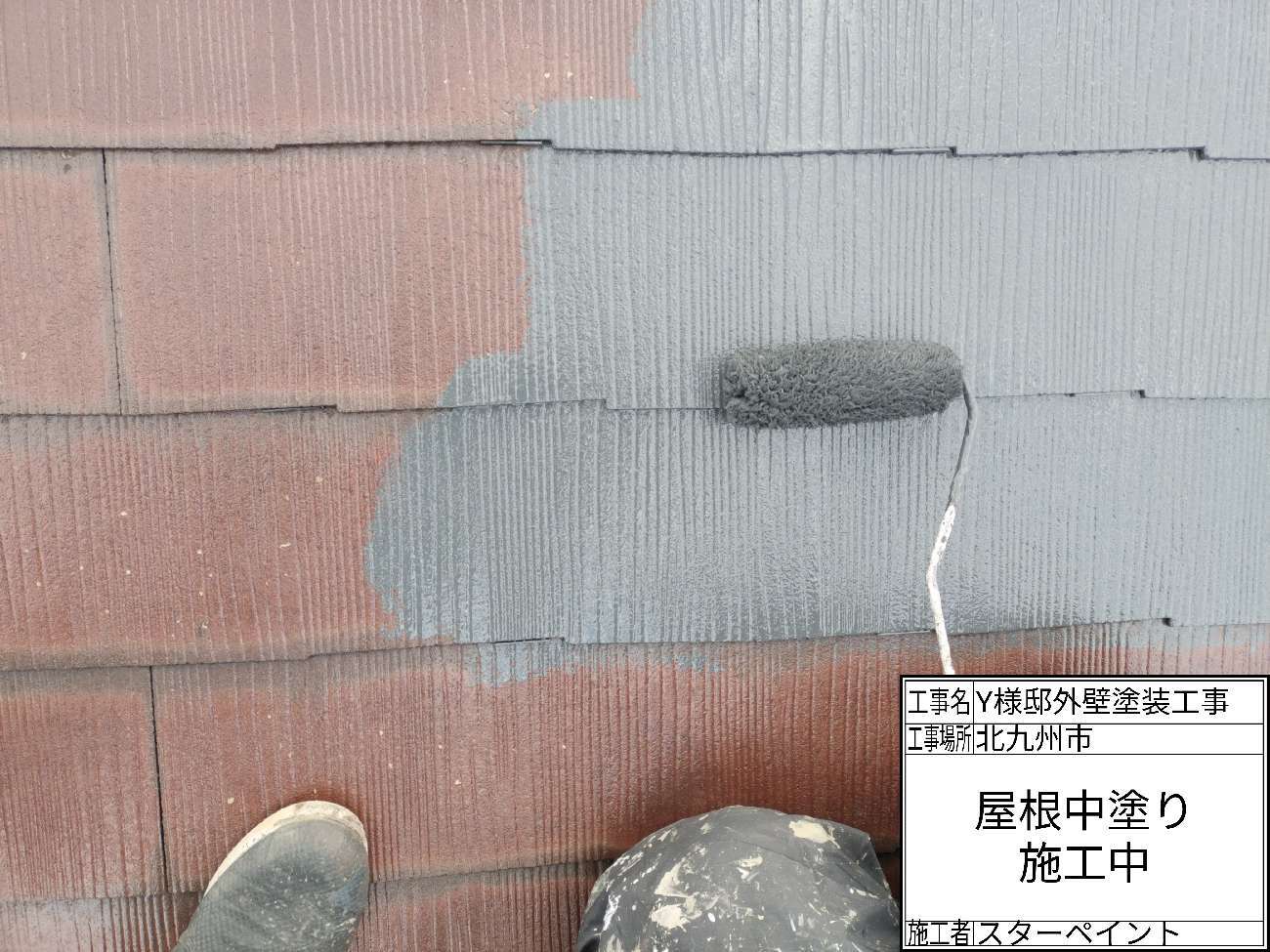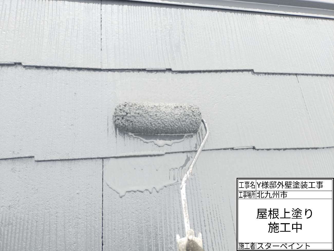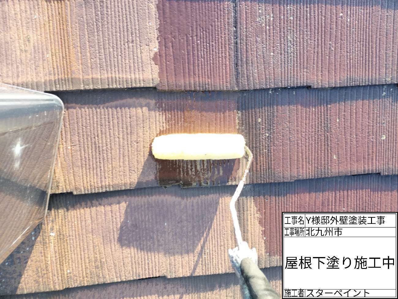 屋根の下塗り塗装作業です。 屋根も同様に3回塗りを行っていきます。