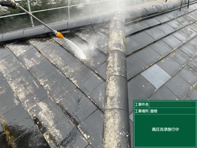 最初に高圧洗浄機で屋根の洗浄を行っていきます。屋根に付着した汚れを落としていきます。