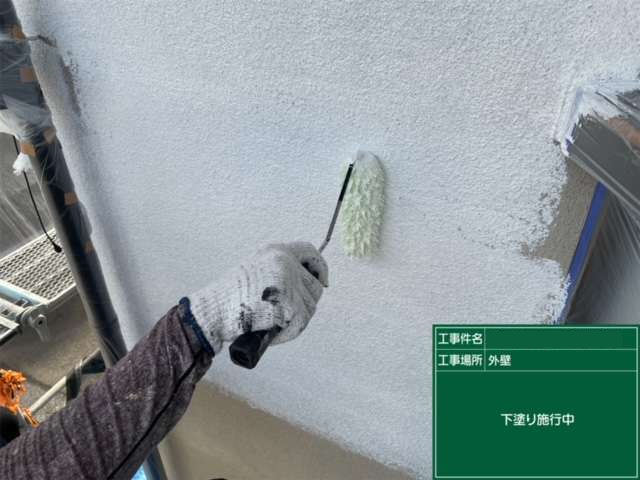 外壁の塗装を行っていきます。まずは下塗り塗装をおこない、密着性を高めていきます。