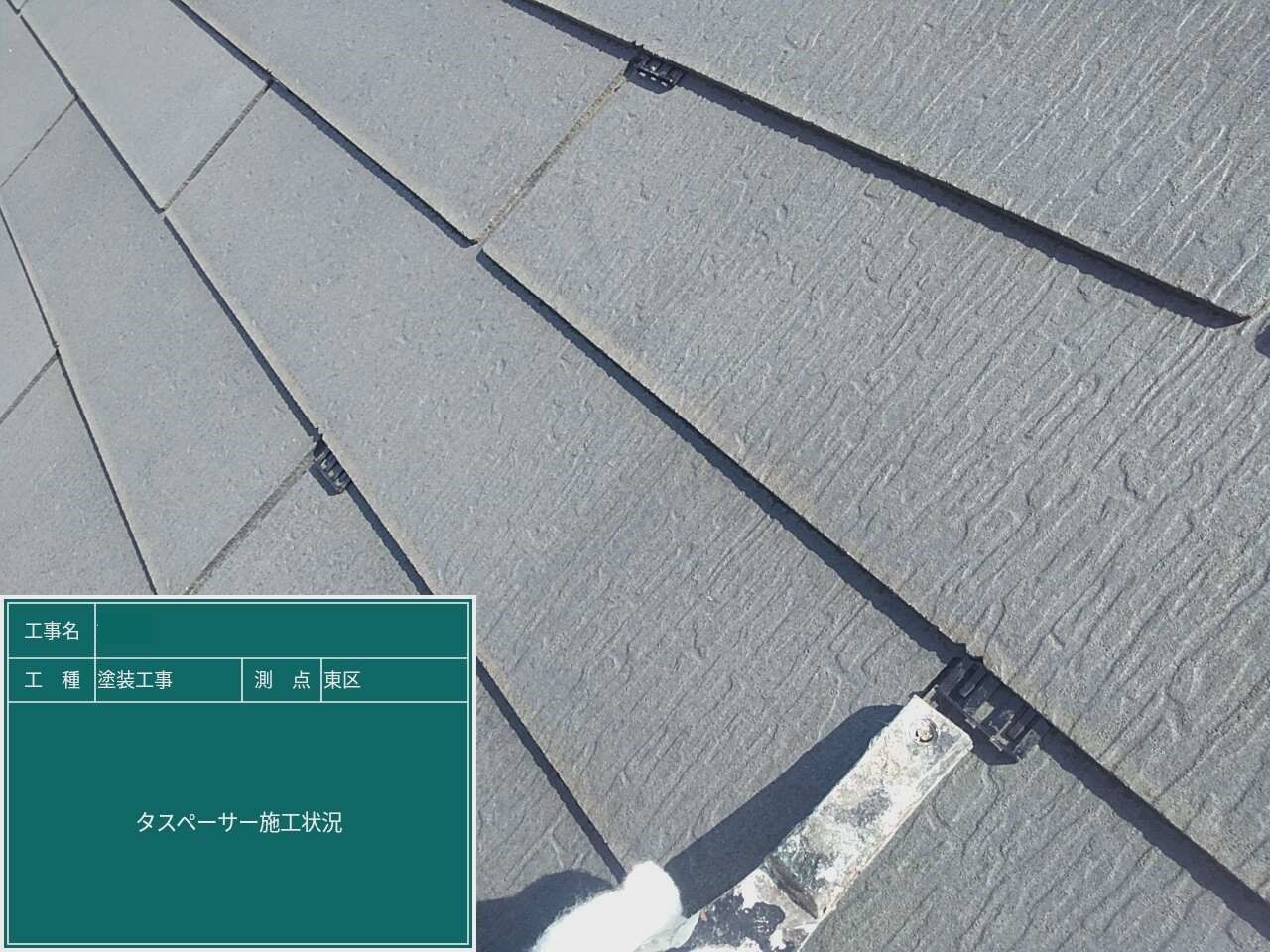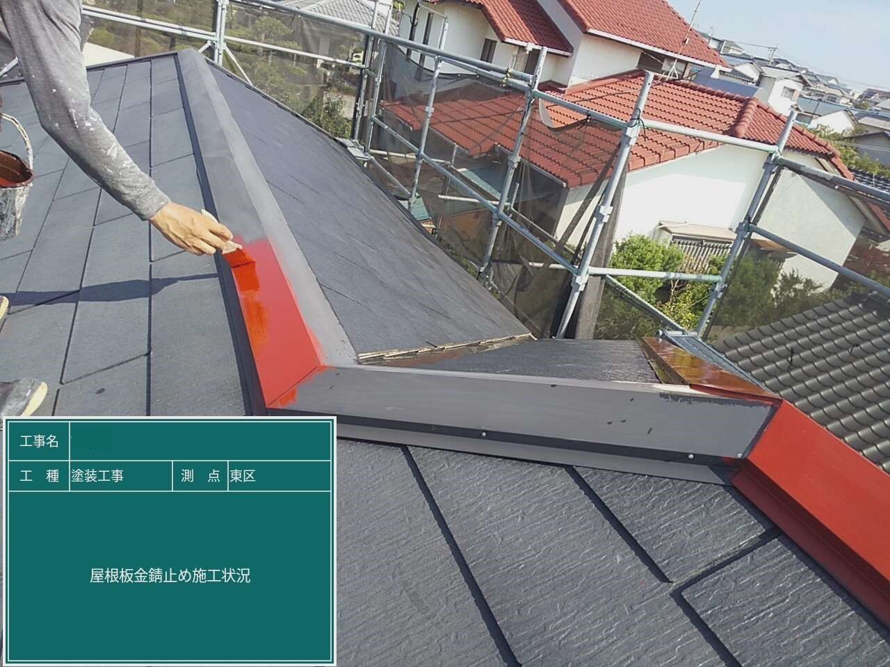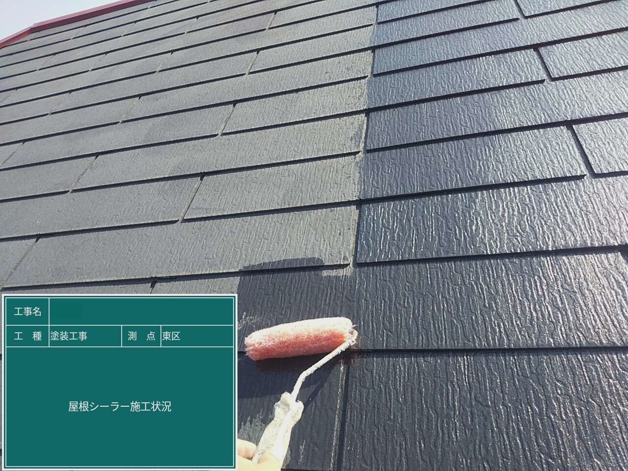 屋根の下塗り作業の様子です。 下地と新しい塗膜をしっかりと密着させるための大切な工程です。