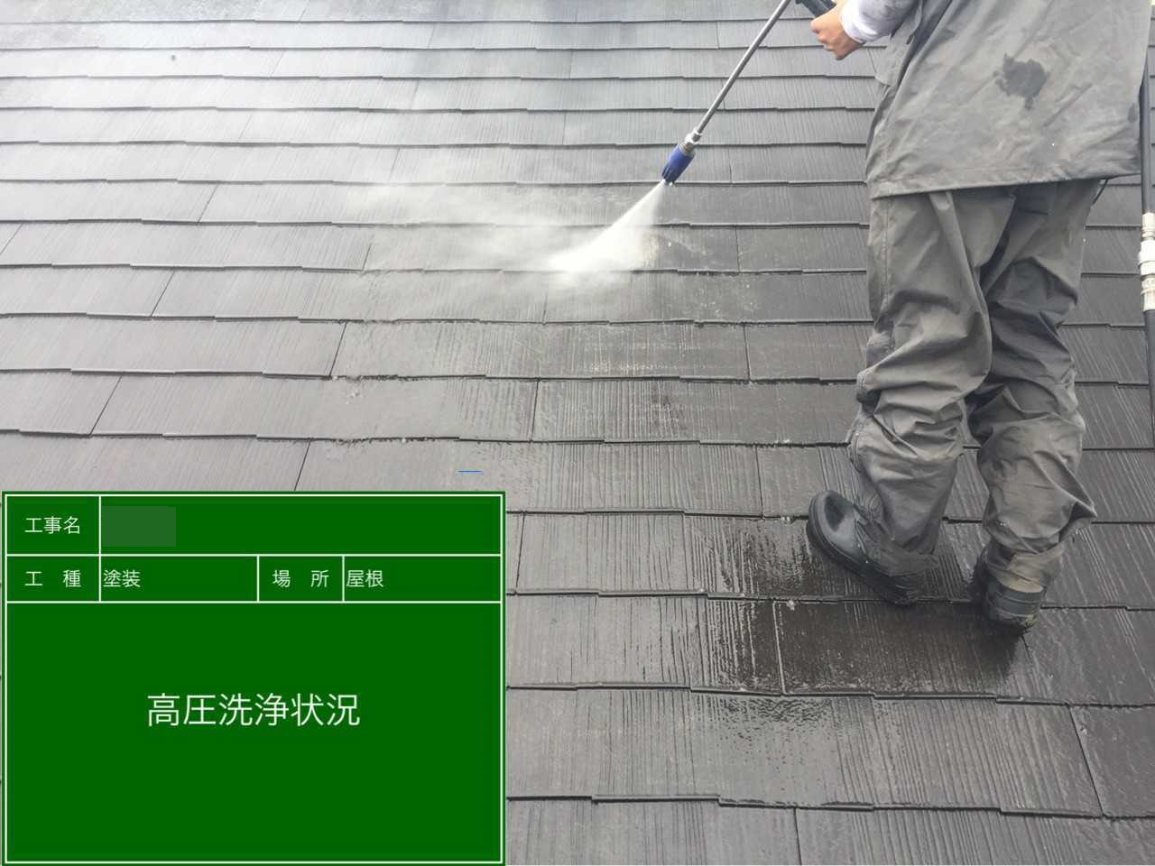 強力な高圧洗浄機で屋根の汚れなどを洗い流していきます。