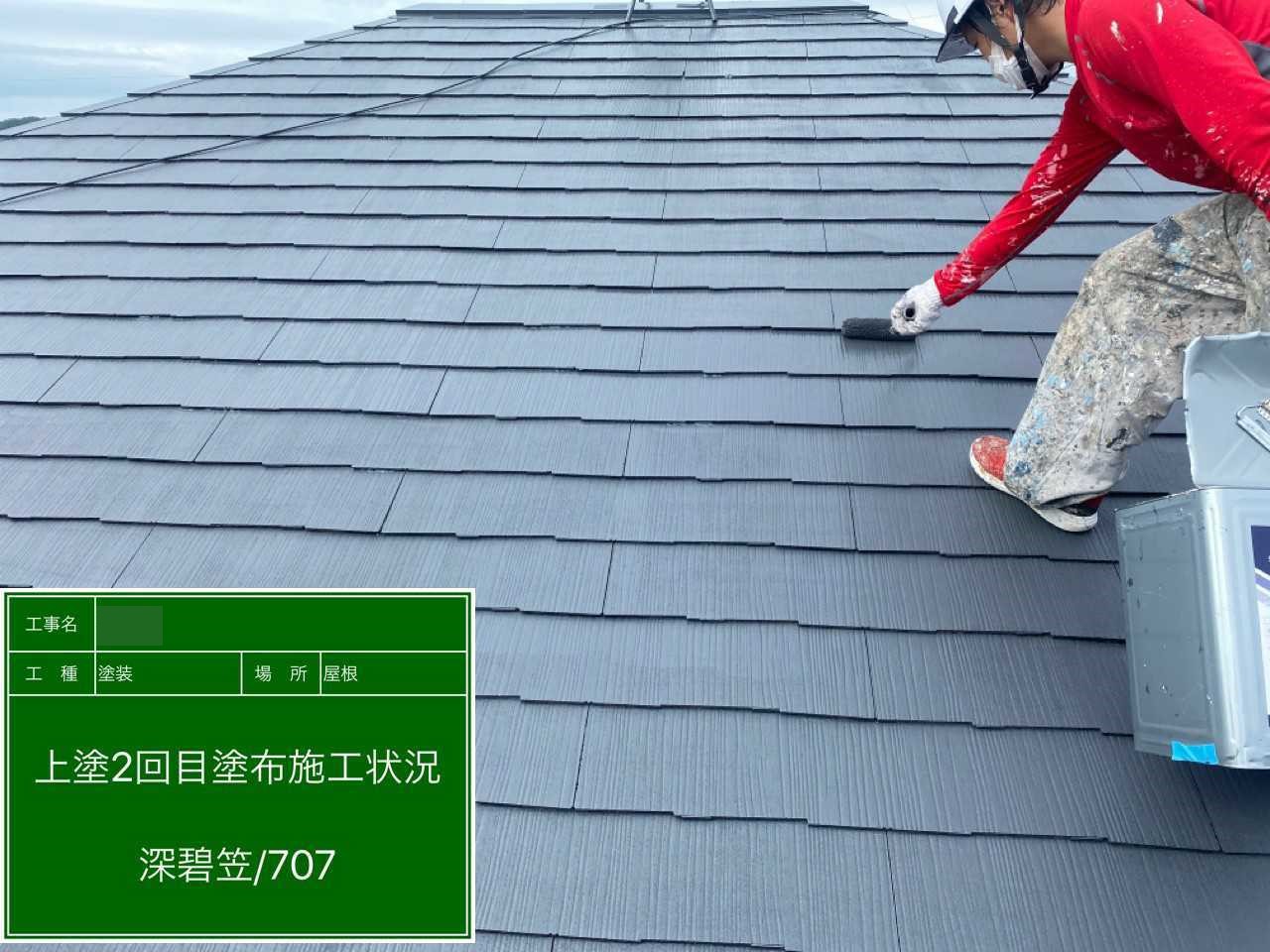 上塗り作業で塗膜の耐候性を高めます。 お屋根は特に直射日光を浴びるなど、厳しい環境下に置かれます。 耐候性にこだわりたいですね!