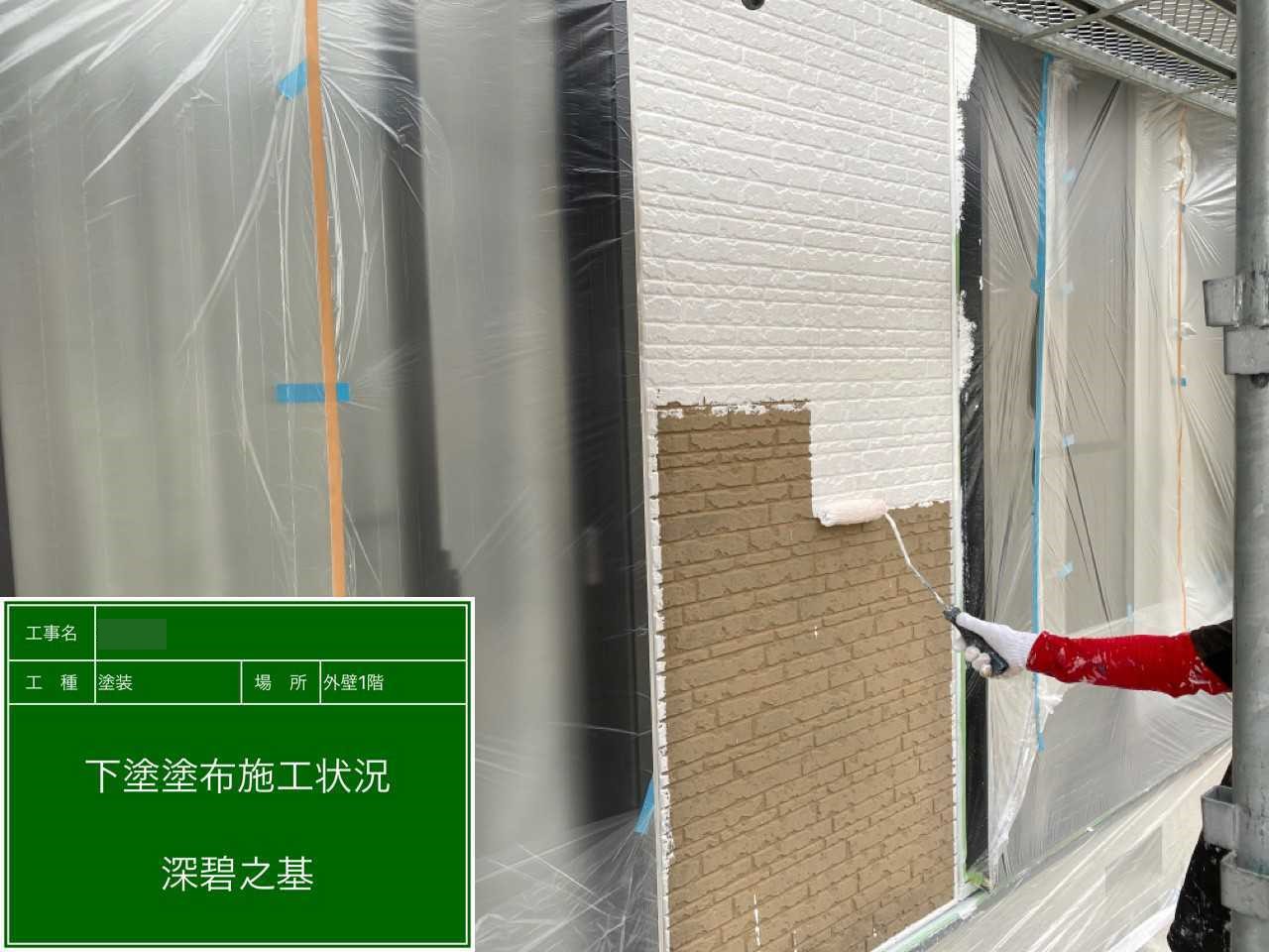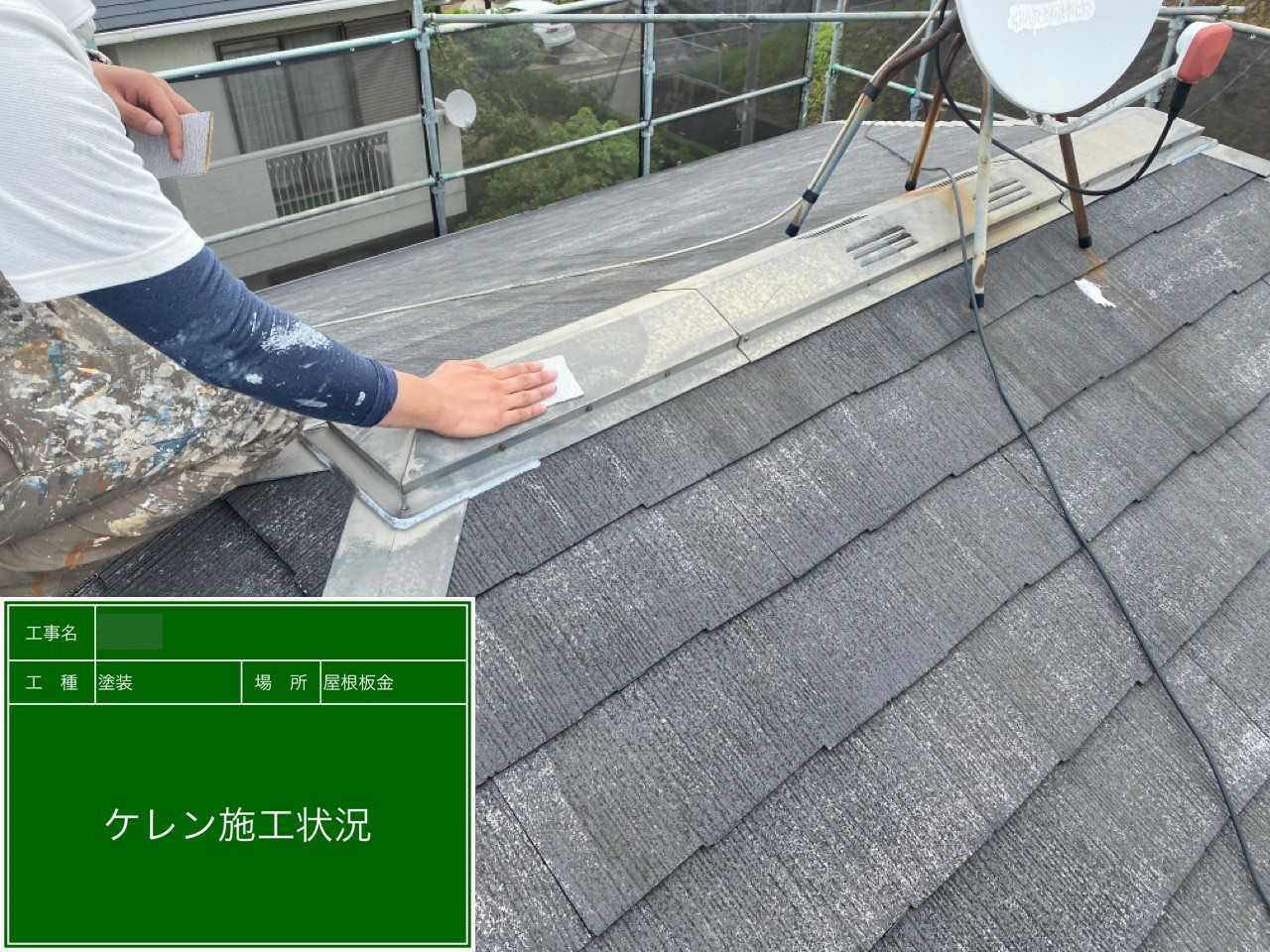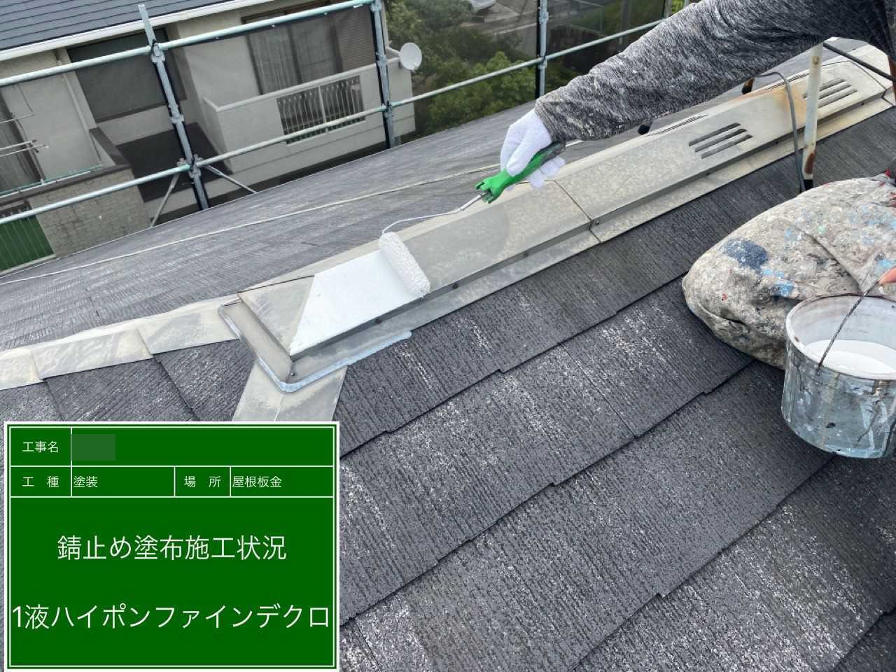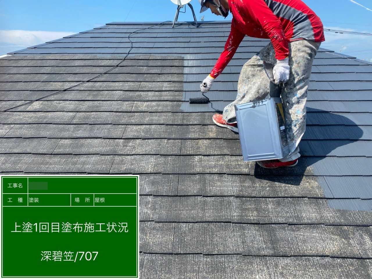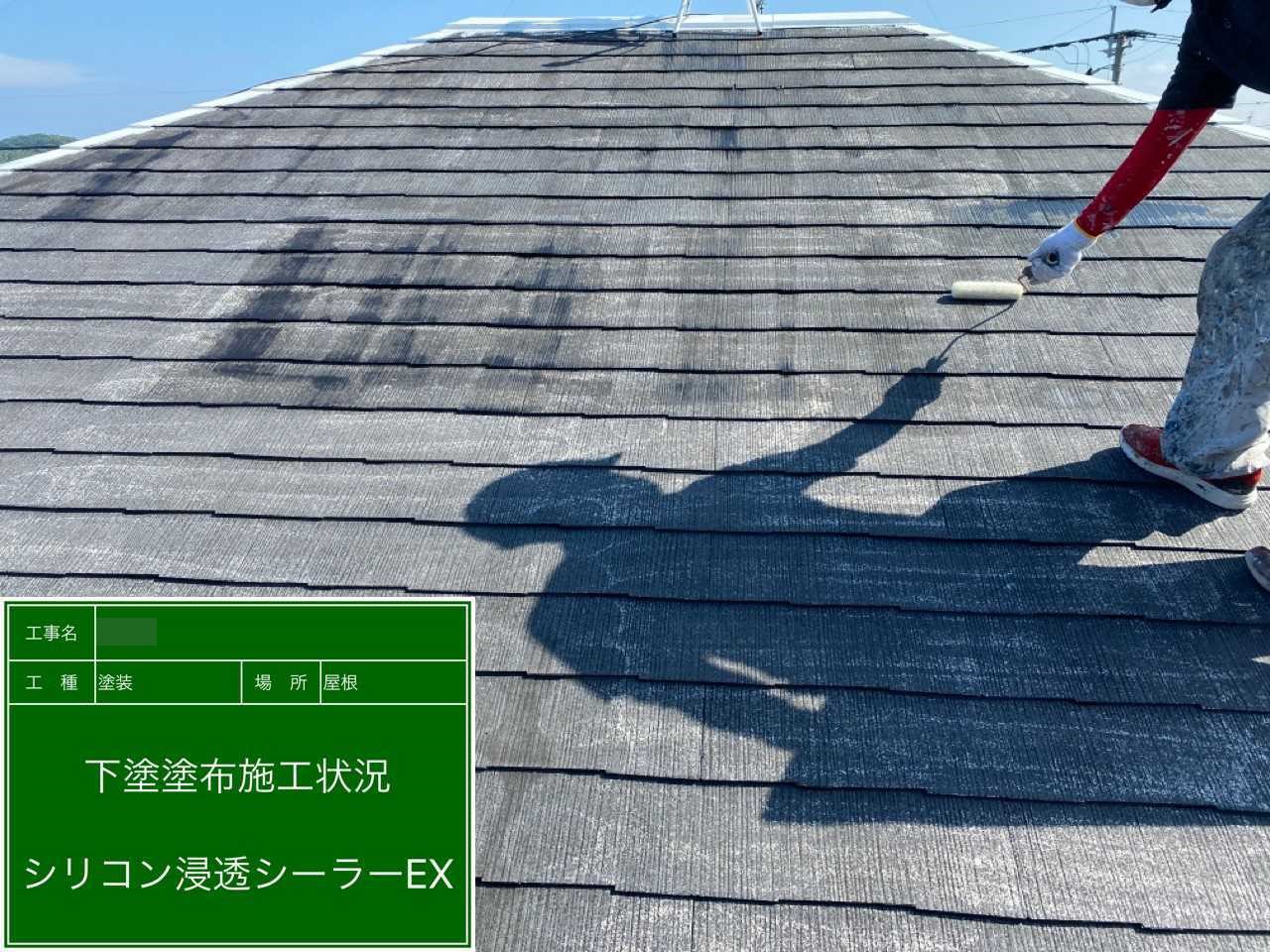 屋根の下塗り作業の様子です。 下地と新しい塗膜をしっかりと密着させるための大切な工程です。