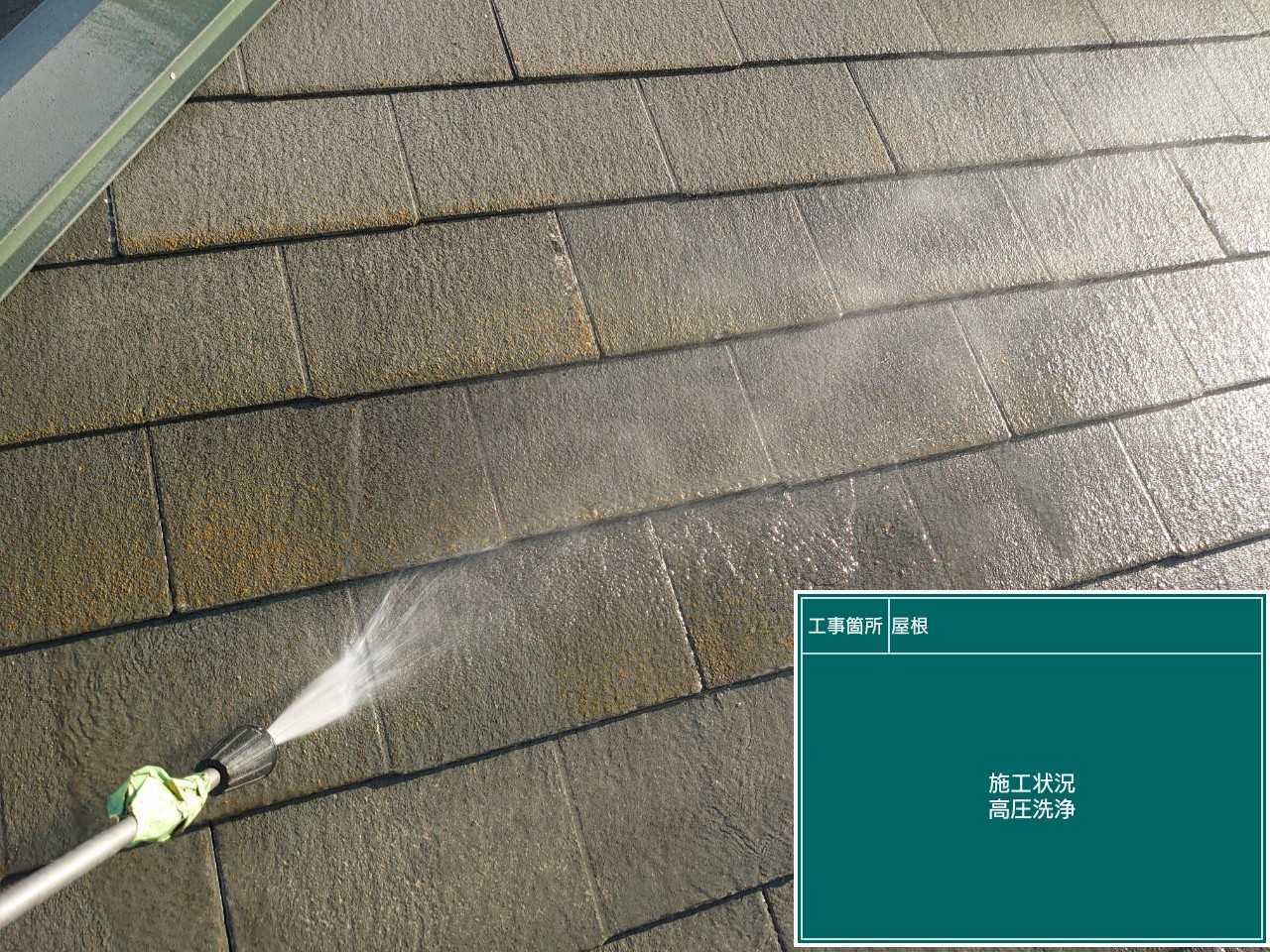 屋根の洗浄作業を行います。屋根に付着している、汚れを高圧洗浄できれいにしていきます。