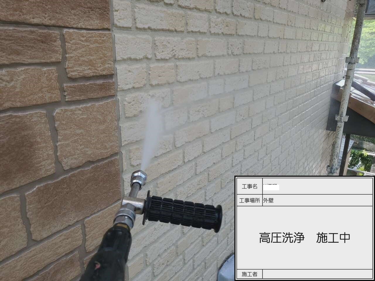 高圧洗浄機を使用し、外壁のホコリ、汚れ、藻、コケ、カビなどを高圧の水で洗い流していきます。