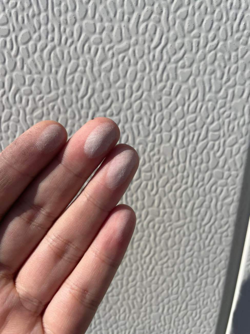 外壁サイディングは全面的に色あせが進行し、手で触れると粉が付着するチョーキングが確認できる状態でした。これは塗膜の樹脂が紫外線で劣化し、防水性が低下しているサインです。特に北面や日当たりの弱い面では、微細な藻・カビが付着しており、雨だれ跡と相まって見た目のくすみが顕著でした。サッシ周りや外壁目地はシーリングの痩せ・ひび割れが進み、硬化に伴う剥離(アドヘージョン切れ)が散見。放置すると毛細管現象で雨水の浸入が起きやすく、内部下地の傷みや室内側の結露リスクを高める状態でした。