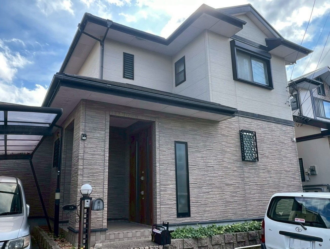 - 築25年になり、これまで一度も外壁・屋根のメンテナンスをしていなかったため、 色褪せやヘアークラックが目立つ状態でした。 周囲の住宅が次々と塗装をしているのを見て、「そろそろ塗装をした方がいいのかな」と感じていたところに営業の訪問があり、本格的に工事を検討されるようになったとのことです。 また、深緑系の色がお好きで、 既存のタイル調サイディングのデザインを活かした仕上がりをご希望されていました。