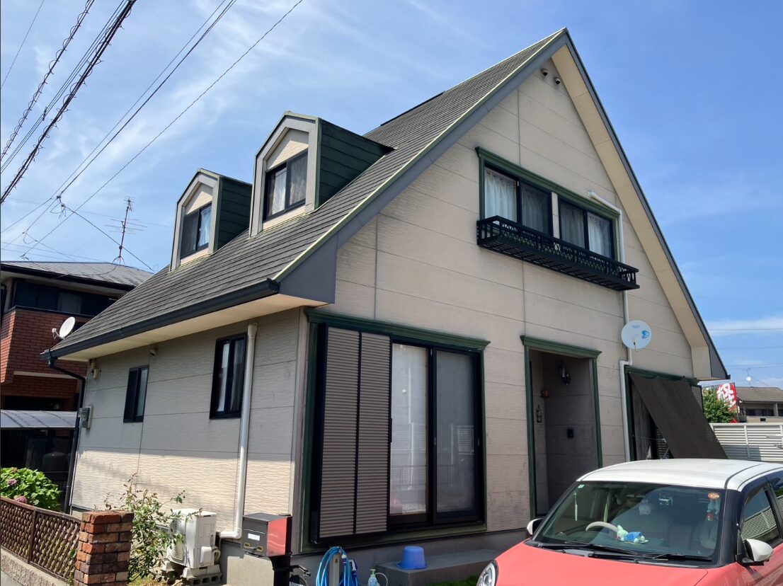 施工前は外壁のくすみやコケ汚れが全体的に目立ち、屋根も色あせによる退色が進行していました。