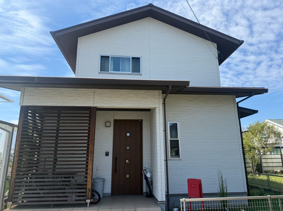 施工前の外壁は、大きな傷みは見られなかったものの、紫外線や雨風の影響により塗装の劣化が少しずつ進んでいる状態でした。特に淡い色合いの外壁は汚れや色ムラが目立ちやすく、早めのメンテナンスが重要です。 今回の施工では、外壁3回塗りを実施。下塗りで外壁材をしっかり保護し、中塗り・上塗りで色ムラのない美しい仕上がりを実現しました。色選びでは、M様が大切にされていた「明るく開放感のある住まい」というイメージをそのままに、空の色と調和する爽やかなブルーを採用。玄関まわりの濃色部分とのコントラストが、建物全体を引き締めています。